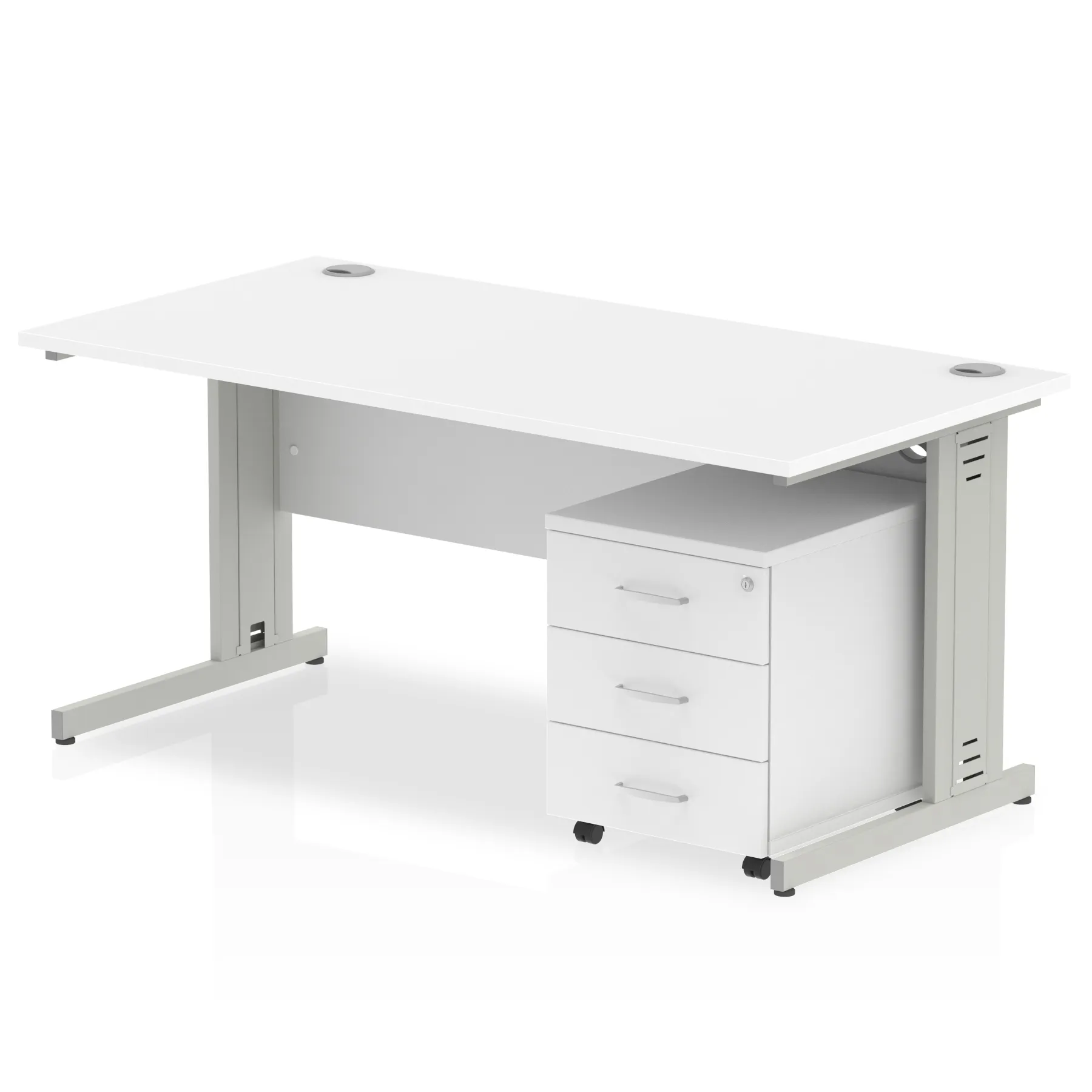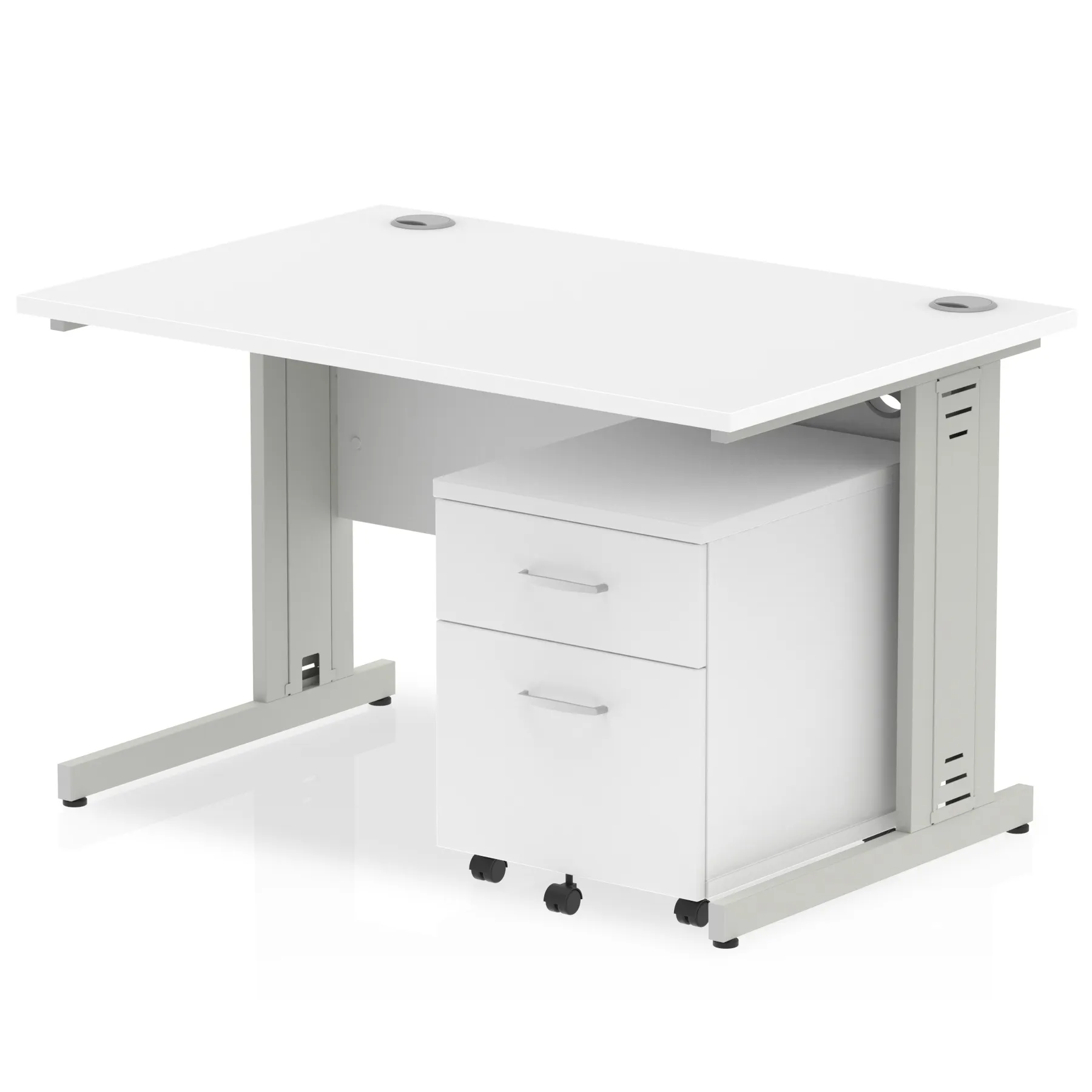 Impulse contract workstation | 25mm tops | Desk and pedestal combined | Heat resistant melamine finish | 18mm modesty panel | 2mm protective abs edging | Cable managed legs | Multiple cable ports | Height adjustable feet | Steel to steel fixings | Modesty panel slots wire slots | Deep set modesty panel (5″) allows for compatibility of most screen clamp fittings