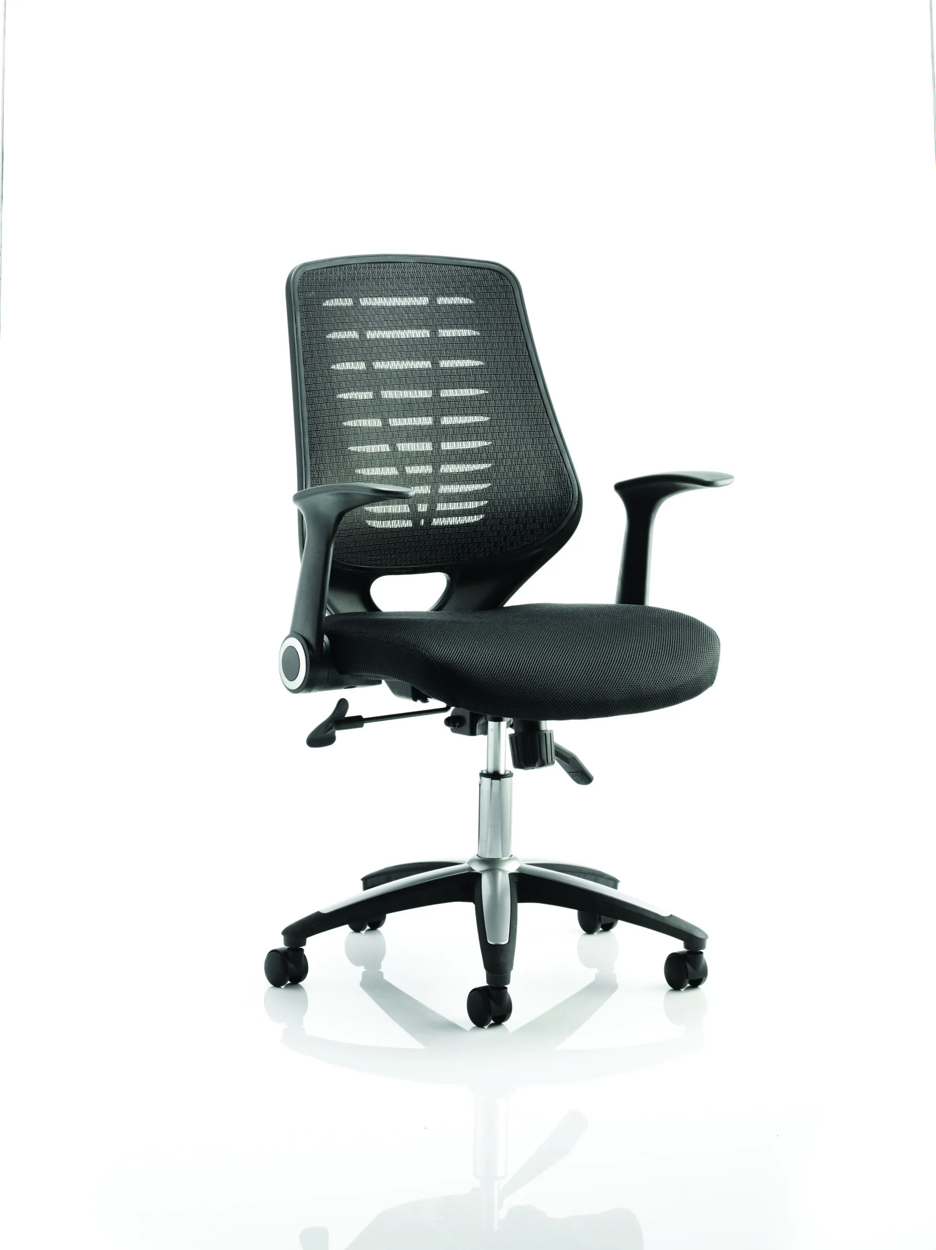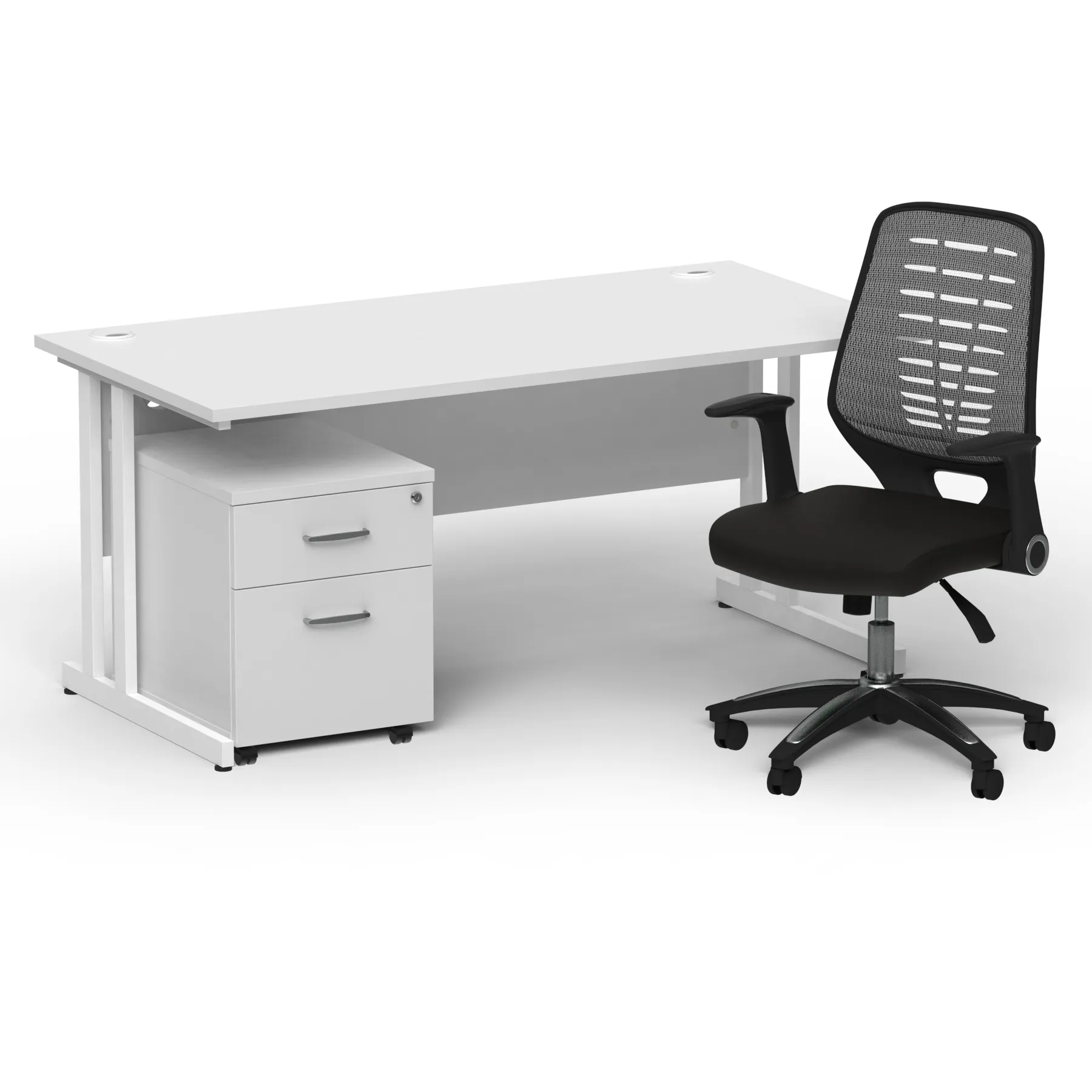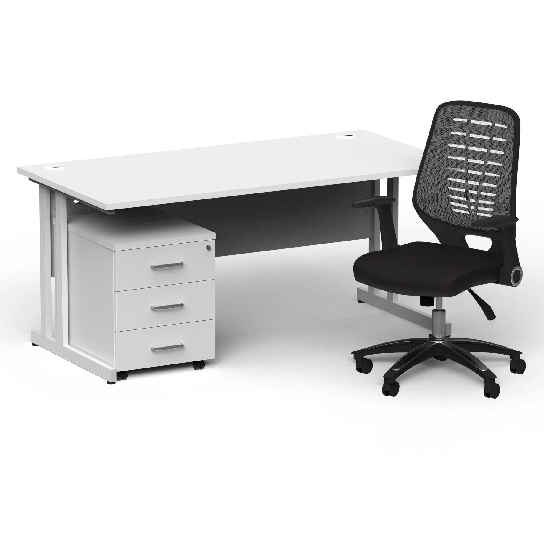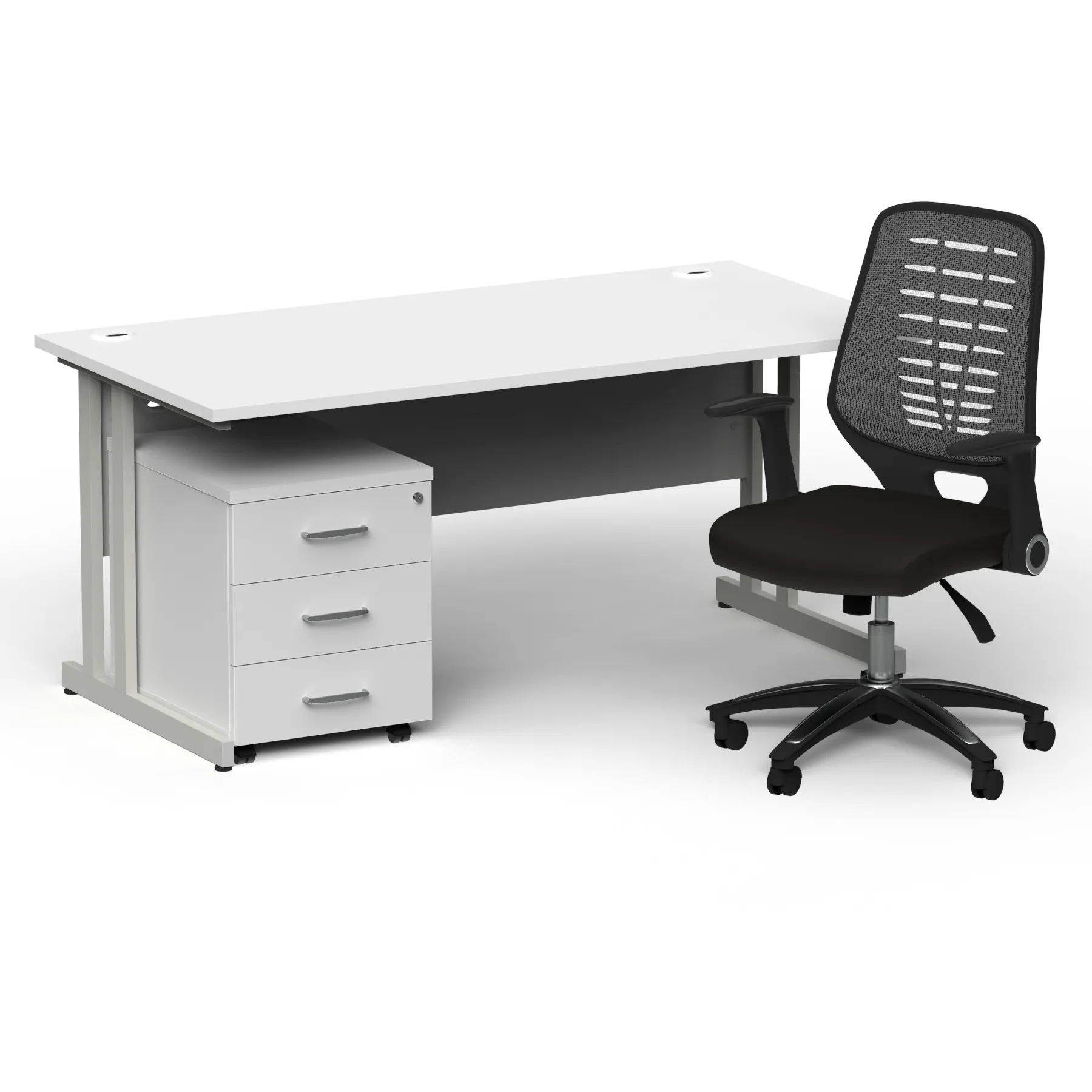 Impulse contract desk | 25mm tops | Heat resistant melamine finish | 18mm modesty panel | Double strut legs | Steel to steel fixings | Impulse mobile pedestal | Steel handles | Smooth running castors for mobility | Lockable drawers | Solid drawer construction | Relay operator chair | Airmesh fabric seat cushion | Soft mesh backrest with stylish design | 2 lever infinite lock tilt mechanism | Weight tension controlled | Fold back boomerang arms | Gas lift tested to 110kg | Usage: 8 hours