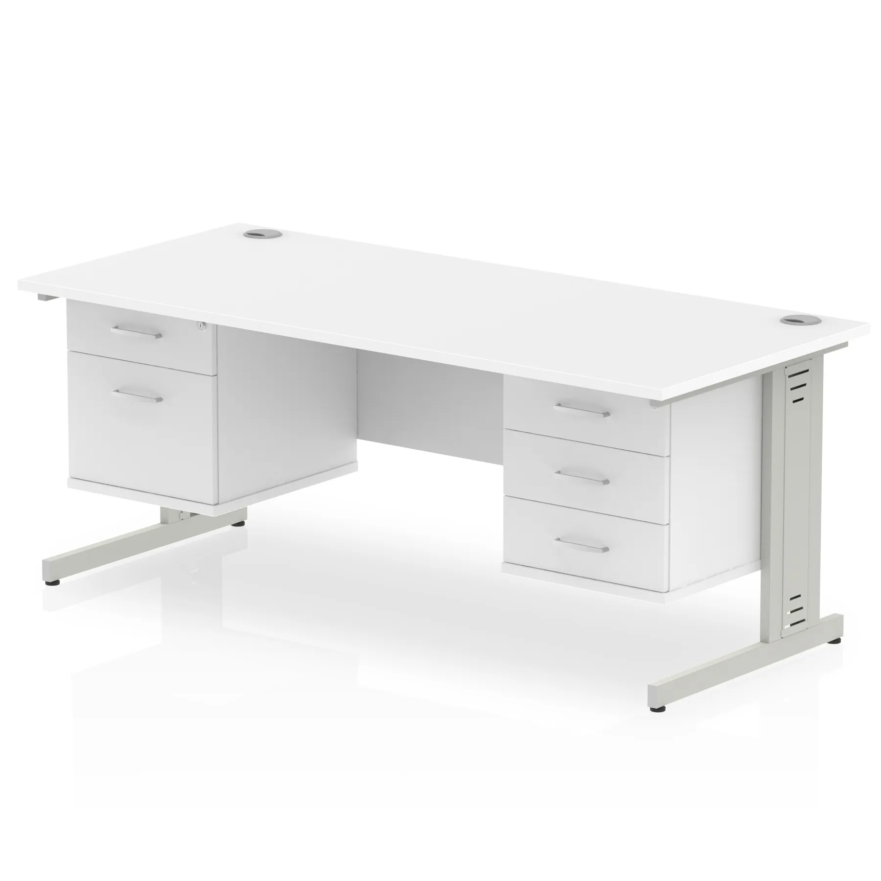 • Impulse contract 1800 wide desk • 25mm tops • Wire management panel • Heat resistant beech melamine finish • 18mm modesty panel • 2mm protective abs edging • Silver coated double strut legs • 2 cable ports • Height adjustable feet • Steel to steel fixings • 2 modesty panel slots • Deep set modesty panel (5”) allows for compatibility of most screen clamp fittings • Fixed pedestal