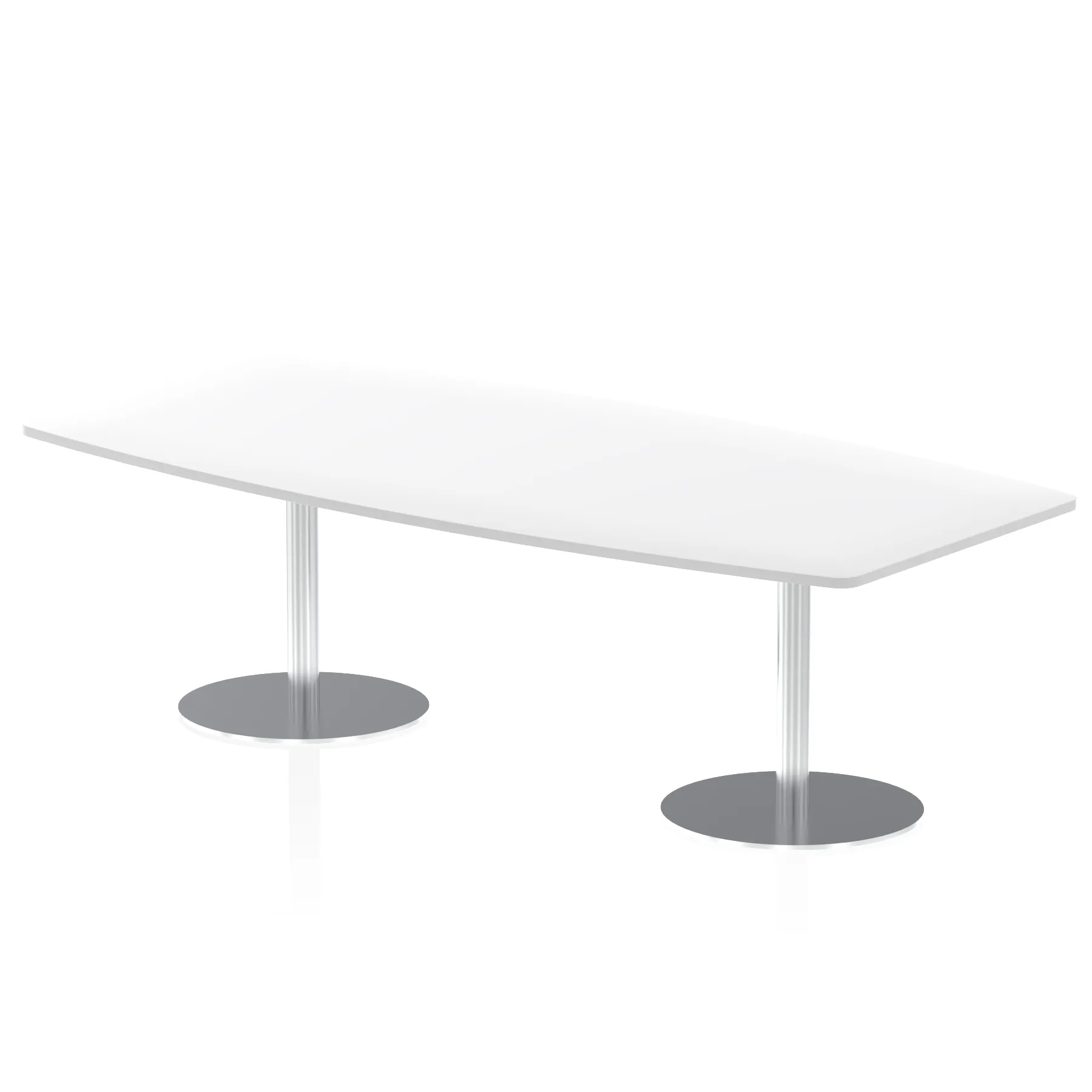 25mm thick desk top profile | Dual, brushed stainless steel effect circular base (580mm diameter) | Brushed stainless steel pillars (76mm diameter) | Weighted base provides stability | Writable desk surface