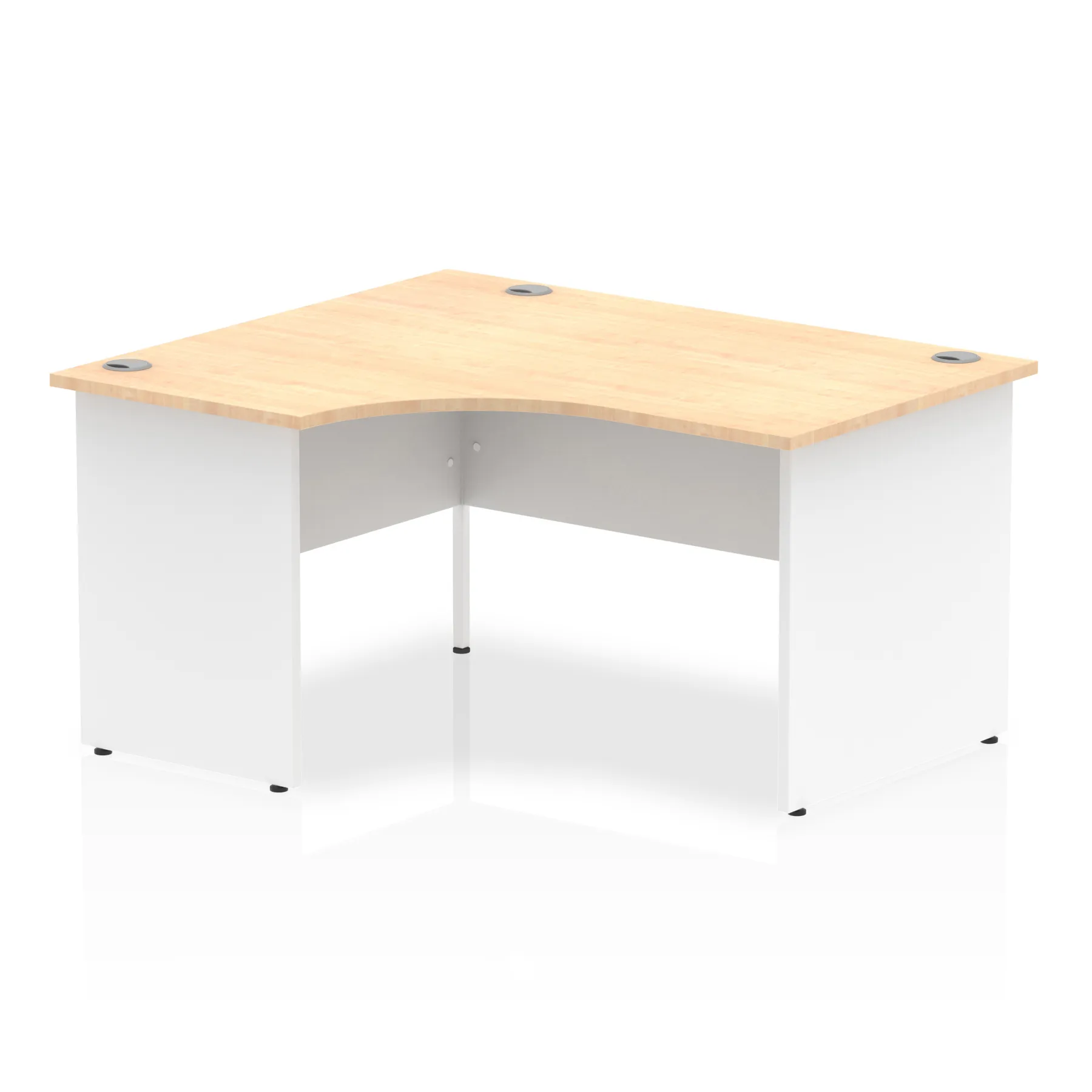 Impulse contract 1400 wide crescent desk | 25mm tops | Heat resistant beech melamine finish | 18mm modesty panel | 2mm protective abs edging | Matching wood panel end legs | 3 cable ports | Height adjustable feet | Steel to steel fixings | 3 modesty panel slots | 600 deep | Deep set modesty panel (5″) allows for compatibility of most screen clamp fittings | Weight Capacity 135Kg