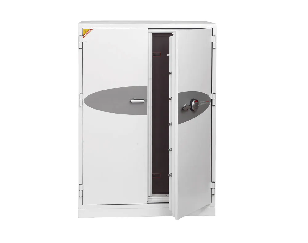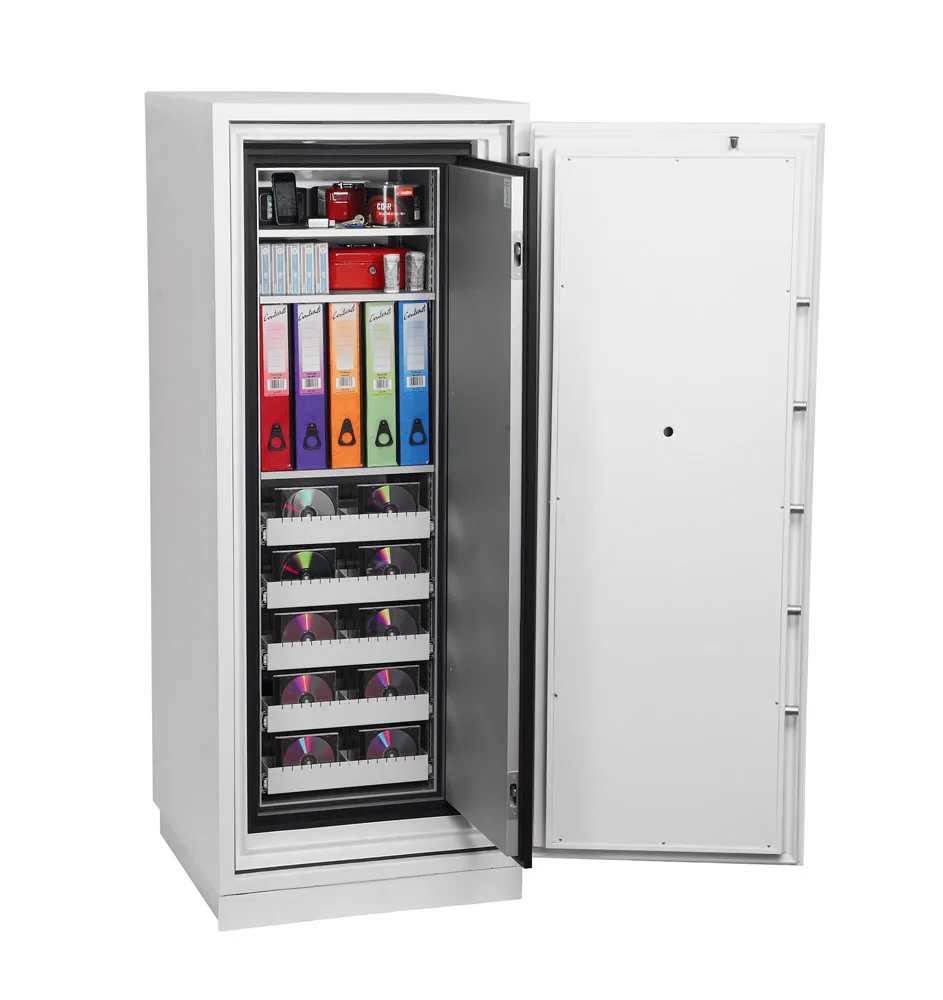 FIRE PROTECTION (DATA) – Tested to Swedish NT Fire 017 – 120dis standard, providing 120 minutes fire protection for computer backup tapes | WATER RESISTANCE – Twin water resistant seals provide an airtight water resistant inner compartment for your computer media | SECURITY PROTECTION – Recommended for an overnight cash risk of £2,500.00 or £25,000.00 valuables | DROP TEST – Fire and impact tested from 9.1 metres for resistance to the impact of falling through the burning floors of a building | SPECIAL FEATURES – Fitted with automatic slam shut locking | FITTINGS – Each unit comes complete with 2 height adjustable shelves and 3 pull out media trays | COLOUR – Finished in a high quality scratch resistant paint RAL9003 White