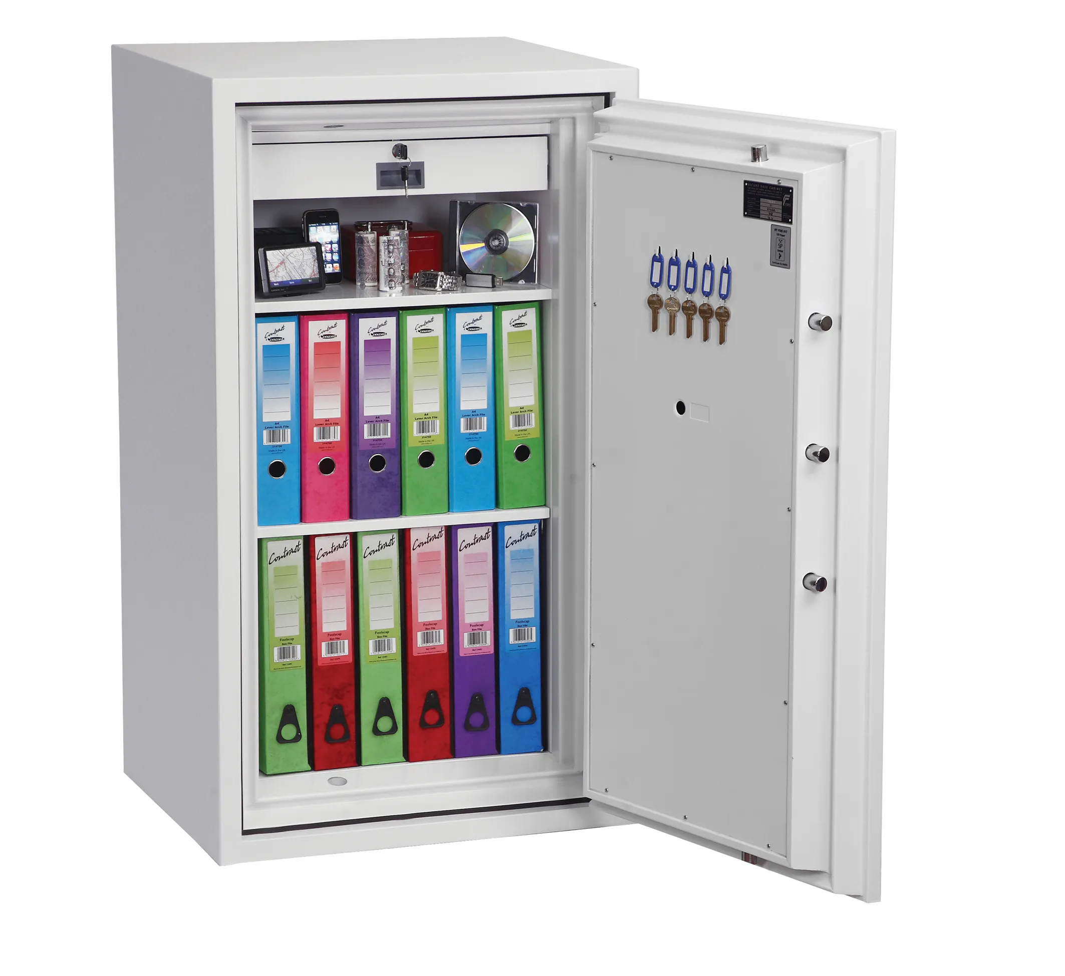 SECURITY PROTECTION – Tested to the prestigious European S2 Security standard (EN14450 ECB.S Certified) giving cash cover of £4,000 or valuables cover of £40,000 | APPROVALS – UK Police approved (Secured by Design scheme) and the Association of Insurance Surveyors (AiS) | FIRE PROTECTION (PAPER) – Tested to the Swedish NT Fire 017-120 Paper standard, providing 120 minutes fire protection for paper documents | FIRE PROTECTION (DIGITAL MEDIA) – Tested to MTC – DIP120 – 60DM fire test standard, providing 60 minutes fire protection for digital media, DVD’s, USB memory sticks and hard drives | FEATURES – Internal lockable steel drawer unit and supplied with 2 height adjustable shelves | DROP TEST – Fire and impact tested from 9.1 metres for resistance to the impact of falling through the burning floors of a building | CONSTRUCTION – Double wall construction with high grade concrete infill to provide both fire and burglary protection | FIXING – Ready prepared for floor fixing, with fixing bolts for concrete supplied | COLOUR – Finished in a high quality scratch resistant White paint RAL9003 | Suitable for storage of controlled drugs whose active ingredients do not exceed 500 grams